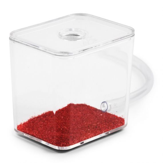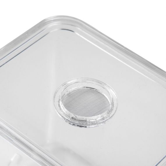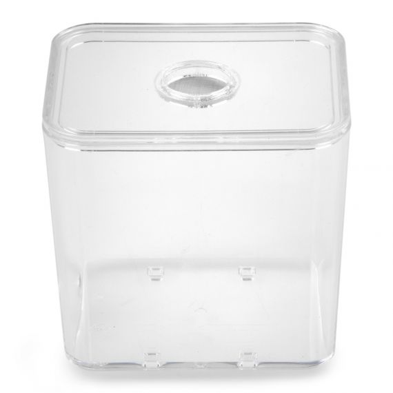 Ha un coperchio in metacrilato trasparente per chiudere la scatola di foraggiamento. Si può applicare un sottile strato d'olio antifuga sui bordi superiori della scatola per poterla aprire con tranquillità e poter operare al suo interno senza che le nostre formiche scappino.