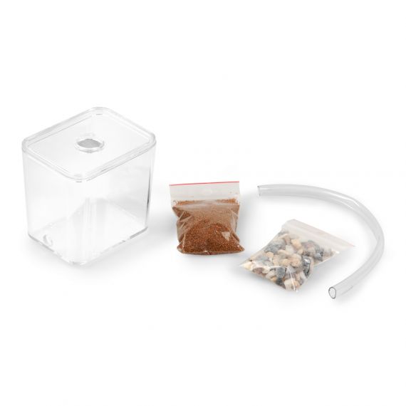 Questo modello dispone di un foro laterale di 8mm di diametro, per il collegamento ad un formicaio o ad un'altra scatola di foraggiamento (un tubo trasparente lungo 20cm è incluso).