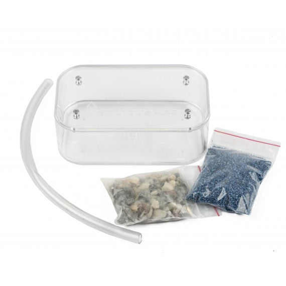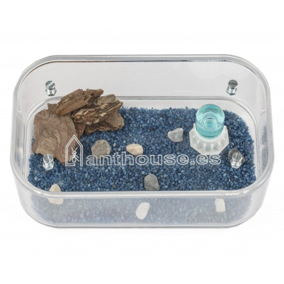 È incluso un coperchio in acrilico trasparente per chiudere la scatola di foraggiamento. Si può applicare un sottile strato d'olio antifuga sui bordi superiori della scatola per poterla aprire con tranquillità e poter operare al suo interno senza che le nostre formiche scappino.