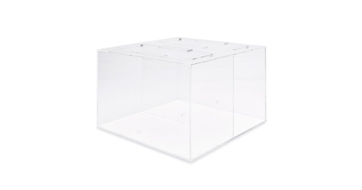 Scatola di foraggiamento in acrilico di grandi dimensioni. La base è bianca e i lati e il coperchio trasparenti, per dare un'ottima visibilità dell'interno.