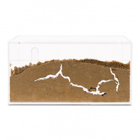 Descrizione: Il kit Anthouse Avvio-Acrilico è una piccola vasca di acrilico, che su un lato ha un pannello di acrilico attaccato (sandwich), lasciando uno spazio di 1,5 cm (qui è dove vivranno le formiche), con un coperchio, anch'esso in acrilico. Possiamo mettere il cibo sul fondo (terreno) del formicaio, che possiamo decorare con sabbia extra e qualche piccola pianta o roccia.