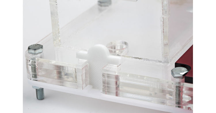 Il deposito è ancorato e fissato allo stesso formicaio grazie ad una gomma elastica, con la quale possiamo trasportare e muovere il formicaio senza perdita di funzionalità.